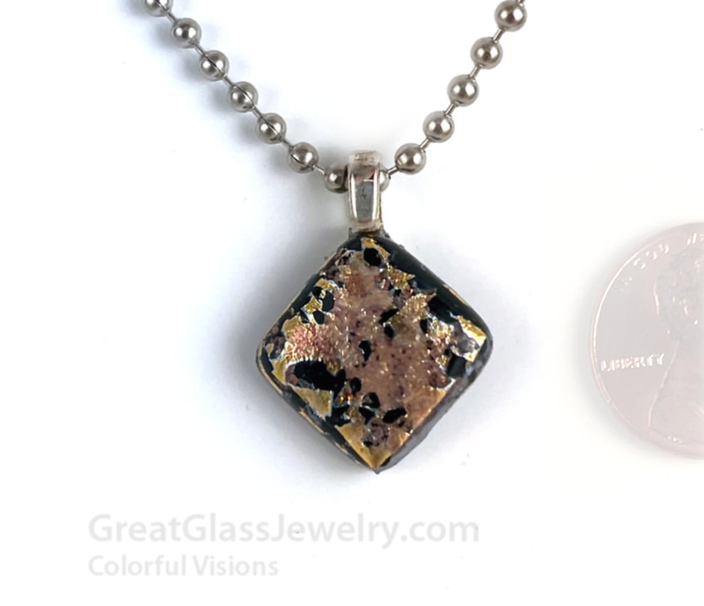 From our petite line, a metallic salmon matte glass is set on clear and melted to a black glass that speckles thru in this shimmering pendant. This pendant may be petite, but it brings the DRAMA in color and finish! Comes with ball chain, select length variant when ordering. Bonded to sterling silver plated bail in a diamond shaped setting.